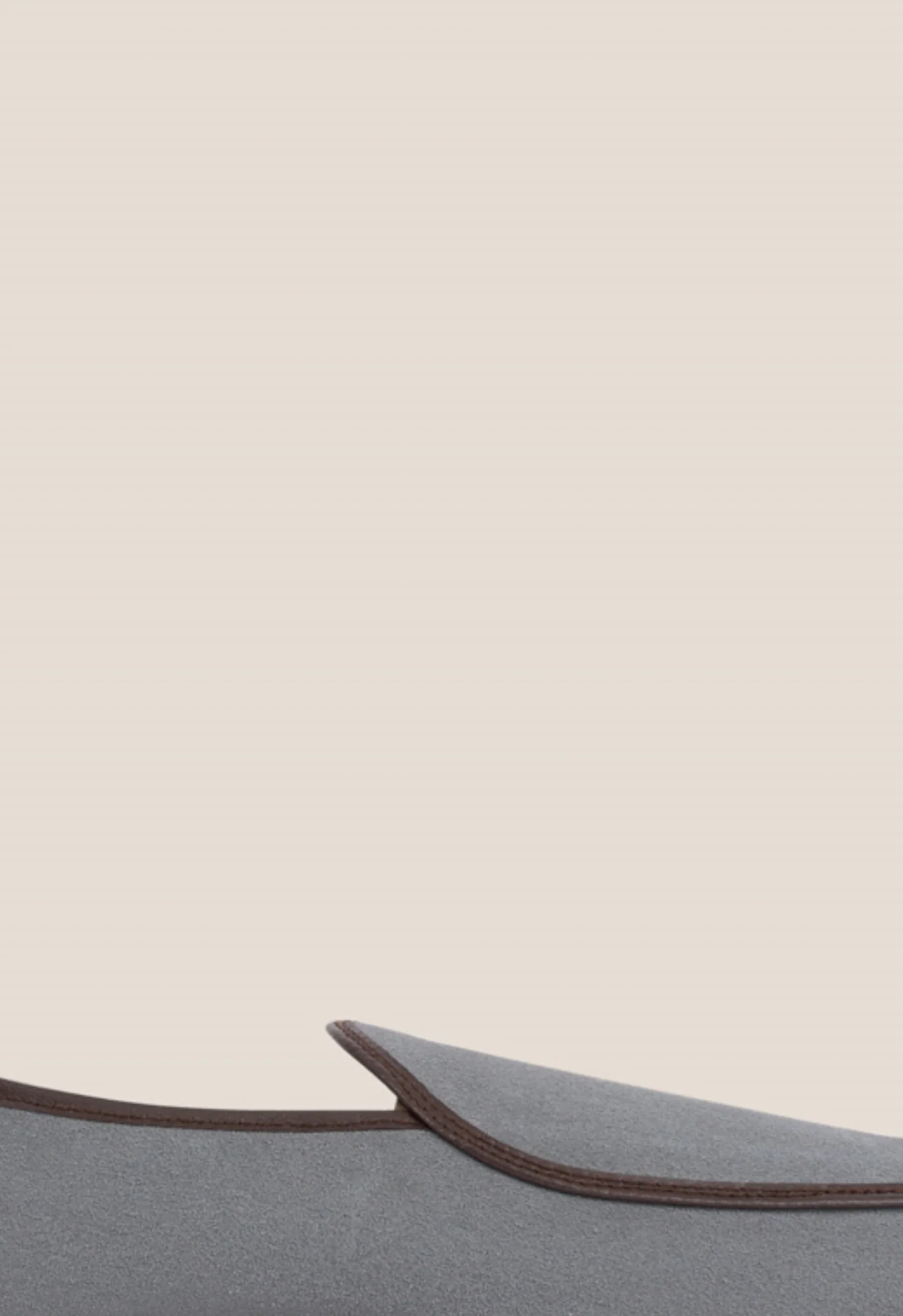 Alpargata estilo mocasín belga en ante de color azul marino con ribete de cuero marrón.