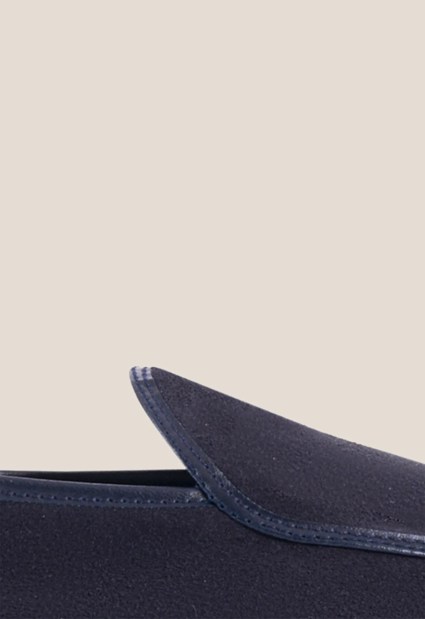 Alpargata estilo mocasín belga en ante de color azul marino con ribete de cuero marino.