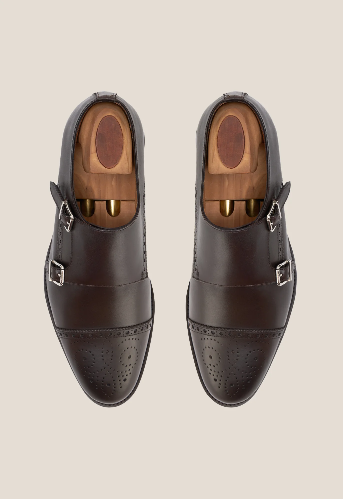 Zapato de dos hebillas con puntera partida y picado delantero y lateral en piel de becerro color trufa.