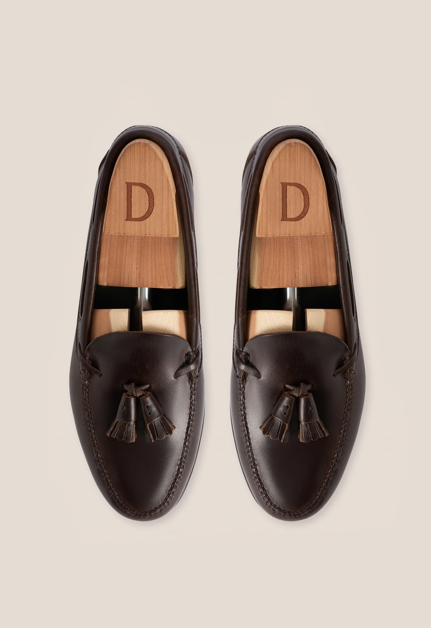 Mocasín de borlas en piel de becerro color cognac con suela mixta de goma y cuero. Acabado con costuras realizadas a mano.