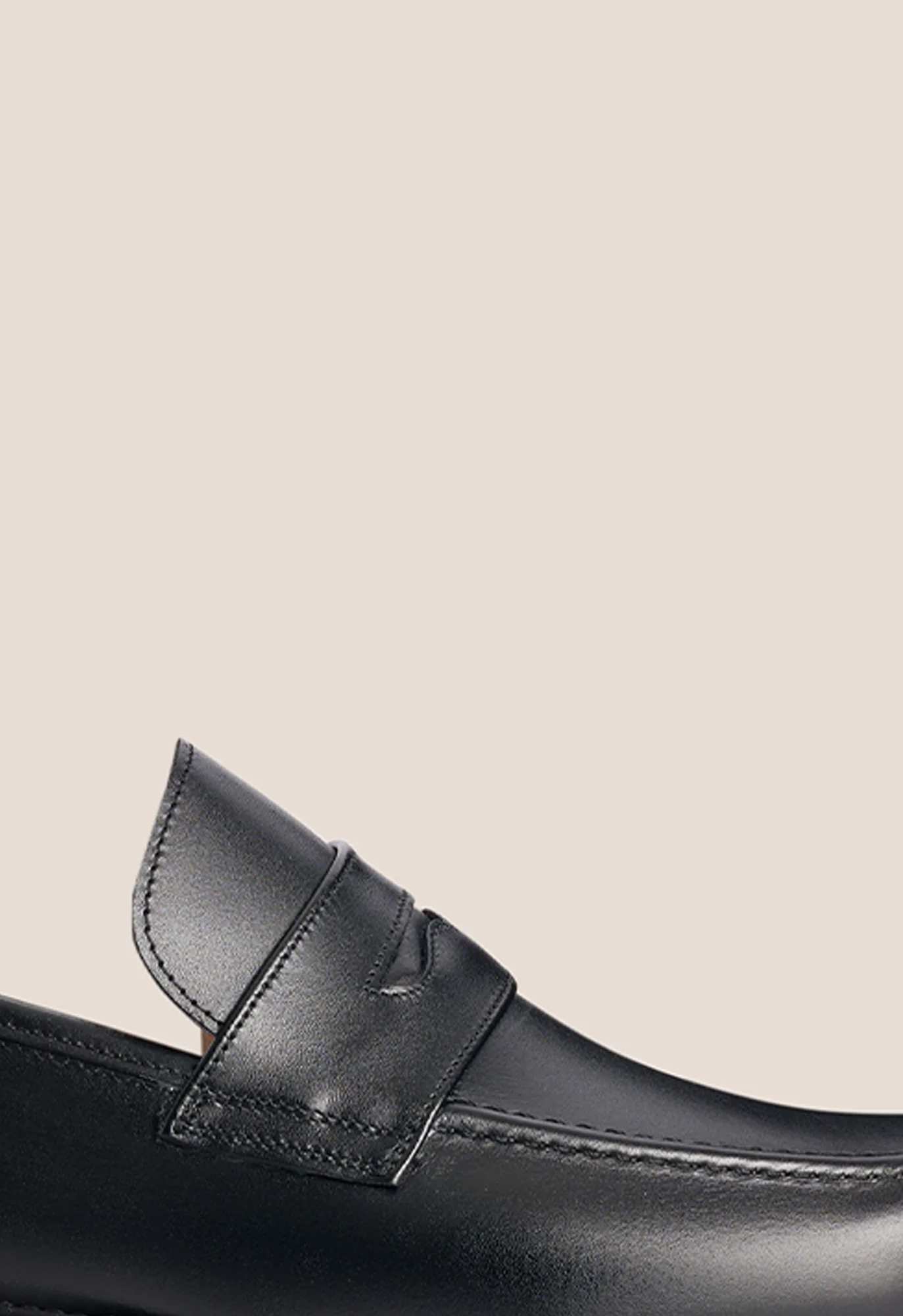 Mocasín de antifaz en piel de becerro color negro con cosido elevado en pala y suela mixta de goma y cuero. Acabado con costuras realizadas a mano.