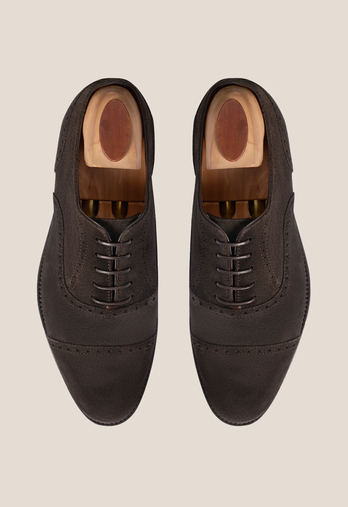 Zapato oxford con puntera partida y picado decorativo en las costuras en ante de color marrón chocolate.