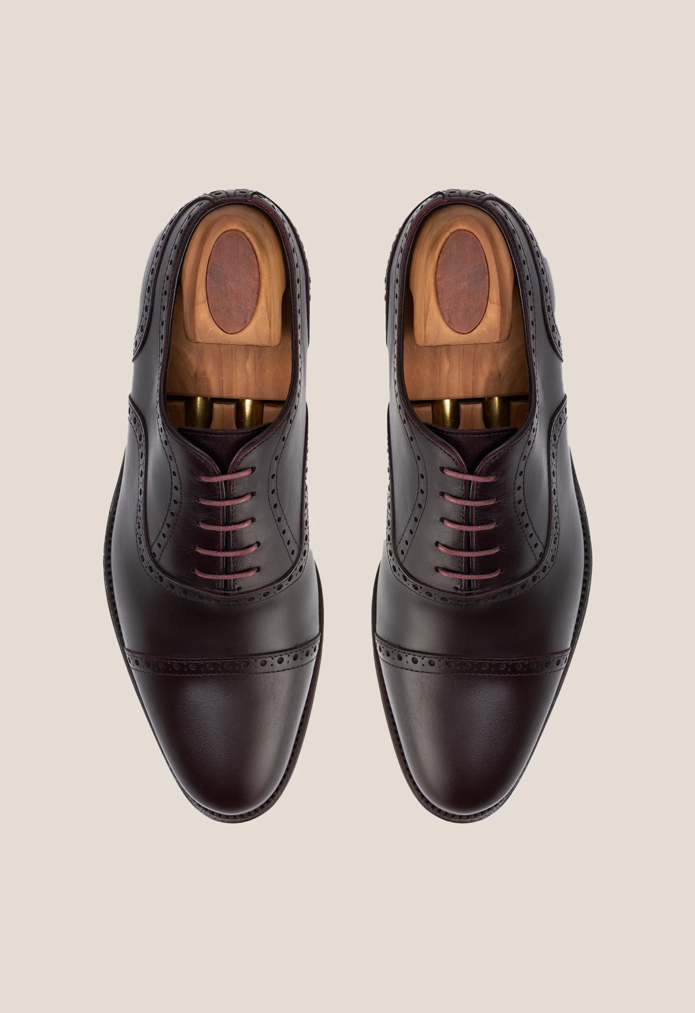 Zapato oxford con puntera partida y picado decorativo en las costuras en piel de becerro de color vino.