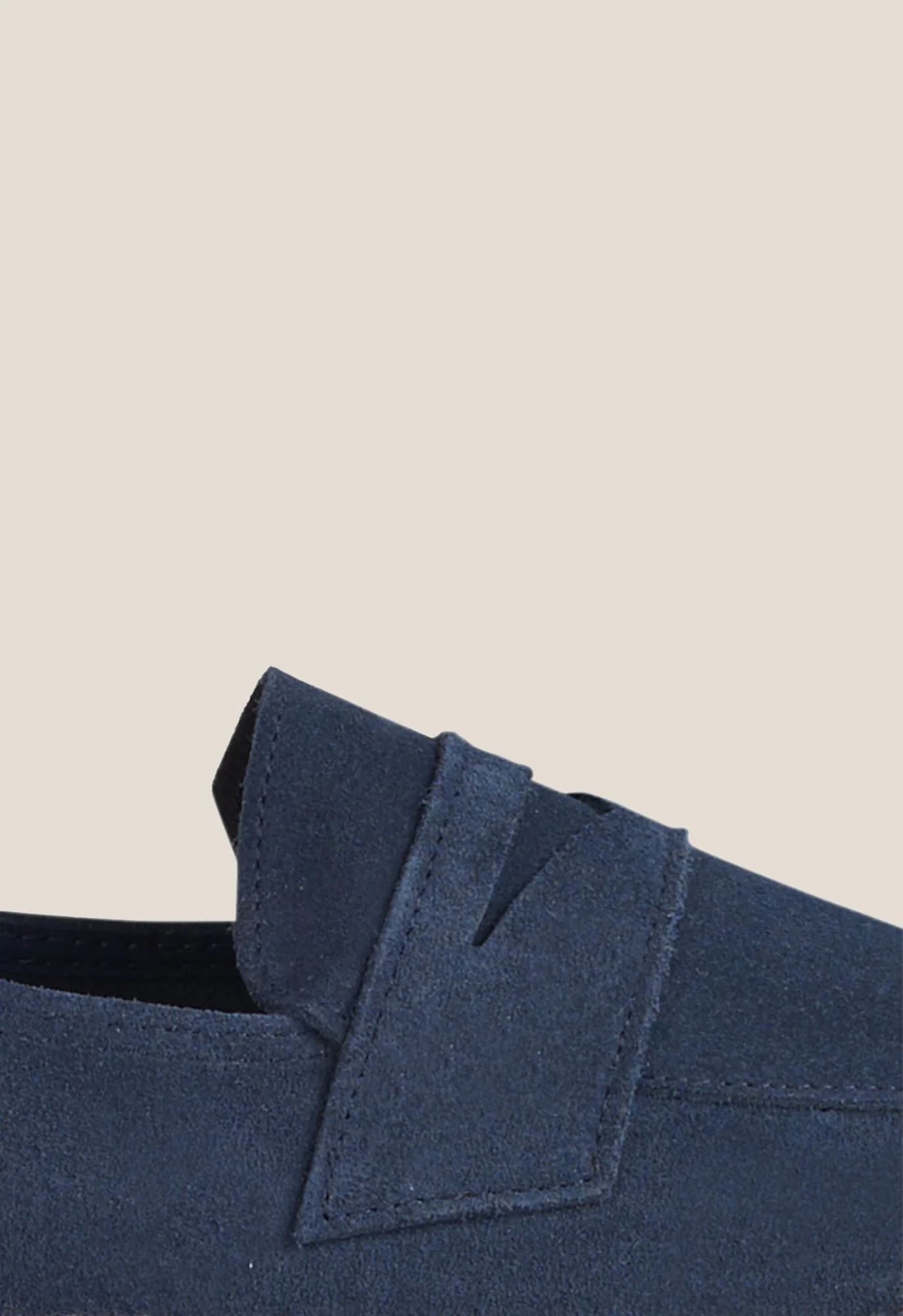 Alpargata estilo mocasín con antifaz en ante de color marino. Suela de yute con acabado de goma antideslizante.